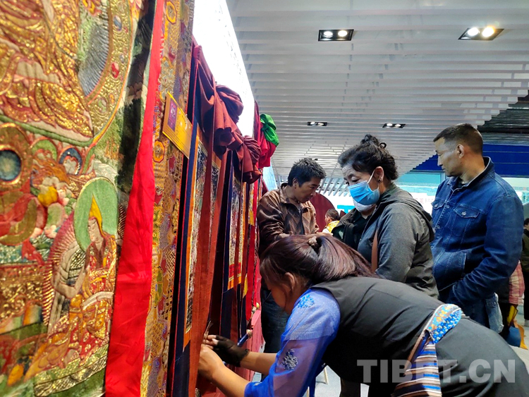 圖為市民在展銷(xiāo)活動(dòng)現(xiàn)場(chǎng)選購(gòu)唐卡