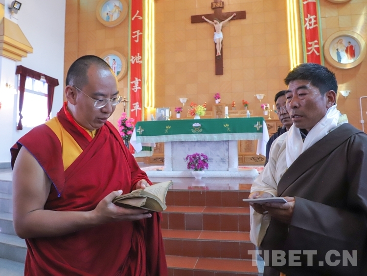 圖為班禪在鹽井天主教堂翻看藏文版《圣經(jīng)》 攝影:賈華加