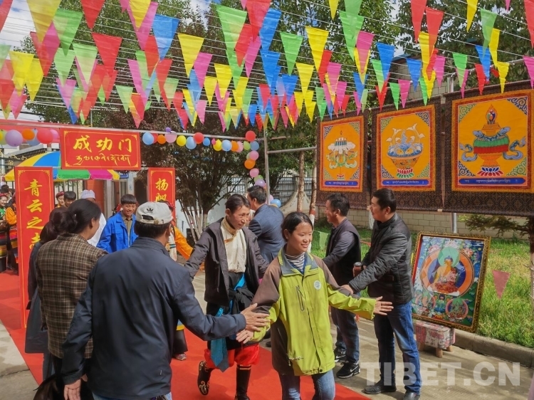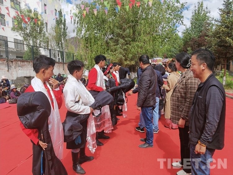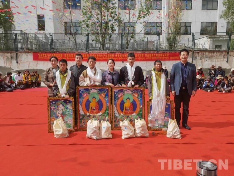 圖為學(xué)校為唐卡專業(yè)的學(xué)生贈(zèng)送自己的唐卡作品和繪畫(huà)工具及顏料等
