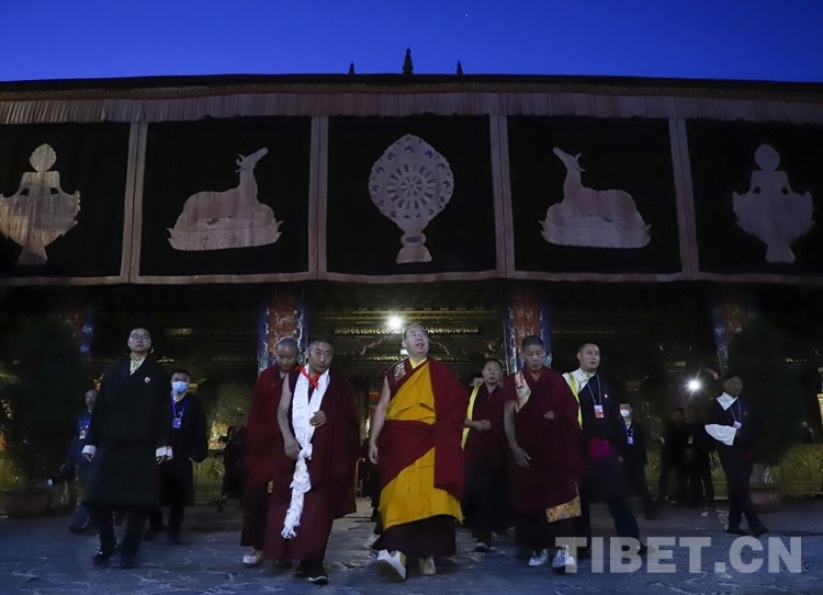 夜色中的古城拉薩靜謐祥和,千年古寺大昭寺燈火通明。凌晨5時(shí)許,大昭寺的僧人組成“色彰”隊(duì),高舉經(jīng)旗、手持藏香,以藏傳佛教最高禮儀在通往大殿的兩側(cè)列隊(duì)恭迎班禪。