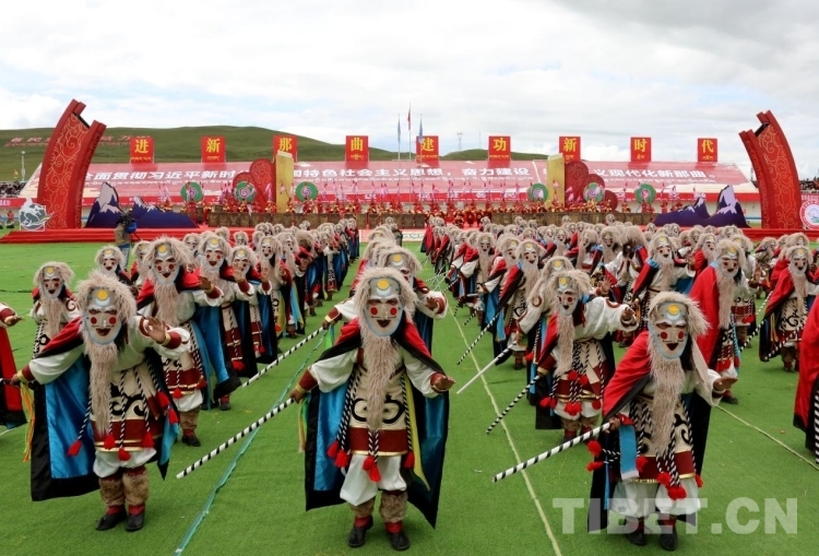 開幕式文藝演出分為《草原飛歌》《奮進那曲》《幸福歌聲》《吉祥鍋莊》四個章節(jié)。格薩爾說唱和折嘎說唱等西藏傳統(tǒng)藝術(shù)瑰寶、“鄉(xiāng)村振興 那曲奮進”活動中涌現(xiàn)出的優(yōu)秀文藝作品、西藏自治區(qū)內(nèi)外著名歌手歌曲連唱、那曲各族人民共跳歡快鍋莊等悉數(shù)登場,帶動開幕式現(xiàn)場氣氛到達高潮。