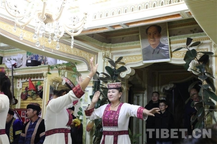 一路前行,在喀什地區(qū)澤普縣的布依魯克塔吉克風(fēng)情小鎮(zhèn),美輪美奐的獨(dú)棟小院是小鎮(zhèn)居民區(qū)的特色,在夕陽的映襯下顯得格外溫馨舒適。好客的塔吉克族老人巴哈爾古麗·熱扎熱情地邀請(qǐng)走訪團(tuán)一行前往家里做客。穿過小院,一進(jìn)客廳就看見門廳上方懸掛著的毛主席畫像。當(dāng)所有人落座后,鷹笛聲響起,身穿塔吉克民族服飾的人們開始翩翩起舞,充滿了載歌載舞的歡樂氣氛。