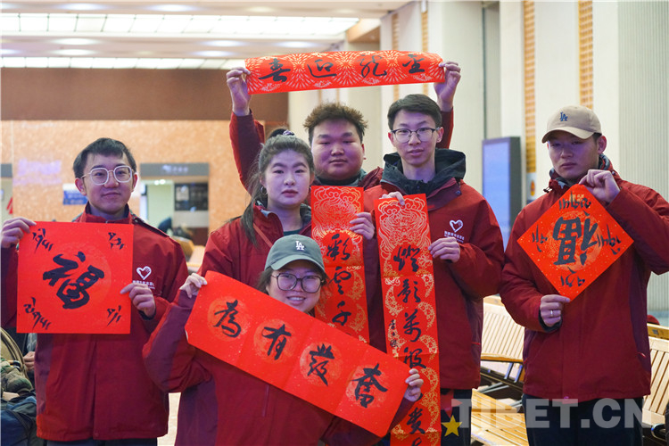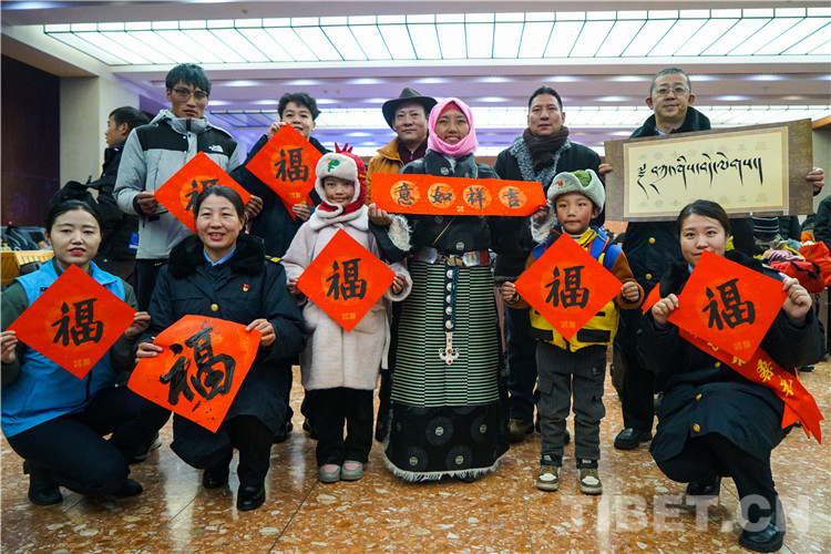 圖為春運(yùn)首日拉薩站向旅客免費(fèi)贈(zèng)送漢藏春聯(lián)及書(shū)法作品 攝影:趙振宇