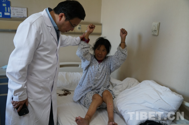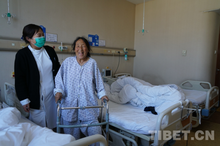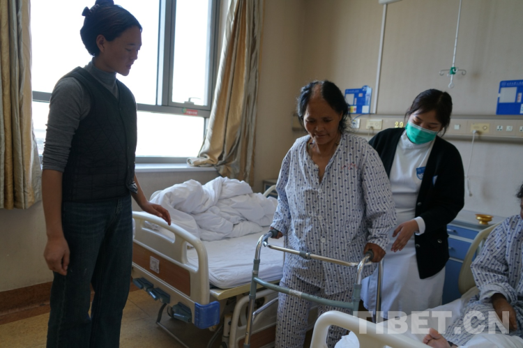 “卓瑪,你快給媽媽翻譯一下,用扶手架轉(zhuǎn)身的時候90度慢慢轉(zhuǎn),不要一次性轉(zhuǎn)180度,容易摔倒?!惫顷P(guān)節(jié)科護士薛小英從剛剛的驚慌中回過神來,對著29床病人布姆的女兒大聲叮囑道。就在剛才,這個來自洛隆縣59歲的右膝大骨節(jié)病患者布姆在骨關(guān)節(jié)手術(shù)24小時后,借助扶手架,在護士的指導(dǎo)下已經(jīng)能夠下床走路了。只是初次使用扶手架還不太熟悉,剛才180度的大轉(zhuǎn)彎讓一旁陪護的護士不禁捏了一把汗。女兒卓瑪聽到護士的話后趕忙告訴媽媽走路轉(zhuǎn)身要慢點,小心別摔倒。