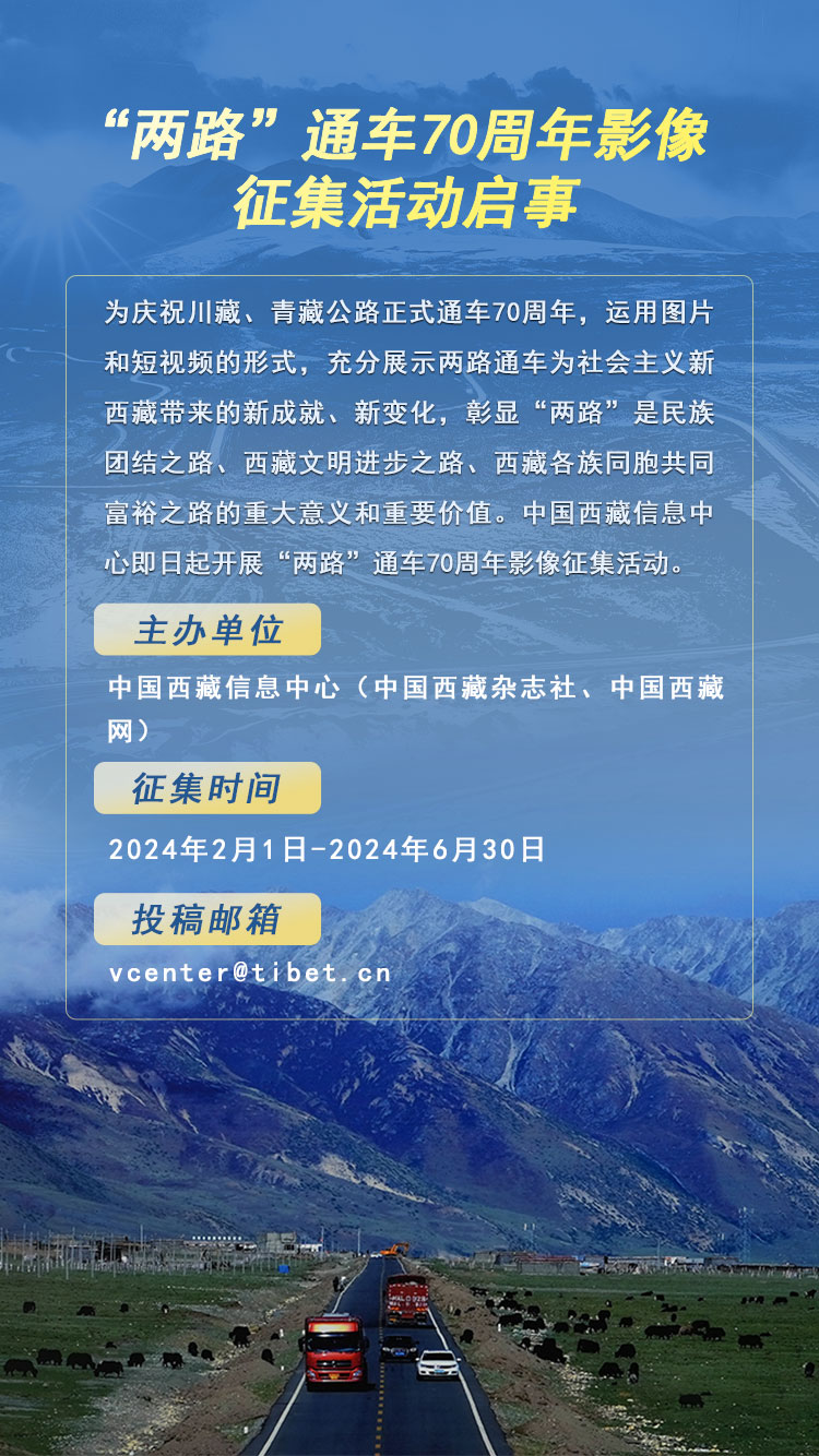為慶祝川藏、青藏公路正式通車70周年,運(yùn)用圖片和短視頻的形式,充分展示兩路通車為社會(huì)主義新西藏帶來(lái)的新成就、新變化,彰顯“兩路”是民族團(tuán)結(jié)之路、西藏文明進(jìn)步之路、西藏各族同胞共同富裕之路的重大意義和重要價(jià)值。中國(guó)西藏信息中心即日起開(kāi)展“兩路”通車70周年影像征集活動(dòng)。