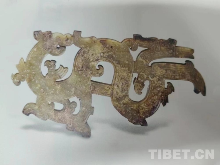 最精妙的是,玉佩整體呈片狀,兩面鏤雕相同紋飾。龍張口回首,龍身滿飾谷紋,尾上雕一大鳥,龍頭內(nèi)外側(cè)及尾部又各凸雕一小鳥,于龍身中部有一圓形鉆孔。此種龍鳳佩是戰(zhàn)國時期特有的造型,手法夸張,圖紋精美,線條卷曲相連,體現(xiàn)了制作者豐富的想象力。(中國西藏網(wǎng) 綜合/周晶 攝影/楊月云)