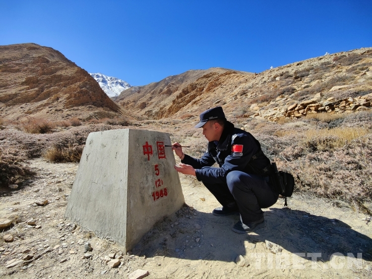 巡邏結(jié)束回到執(zhí)勤點后,邊巴次仁并沒有卸下執(zhí)勤裝備,而是拿著毛筆和紅油漆朝著執(zhí)勤點的河對岸走去,過河幾百米便是中尼5號界樁?!爸挥袌允卦谶吘车奈覀儾拍荏w驗到,除夕這天,為界碑描紅的自豪感?!彼贸雒P跟紅漆一筆一劃地描著界碑上的每一個字?!懊杓t界碑那一刻,眼前是界碑,身后是祖國,我們守的是萬家燈火。”邊巴次仁眼神堅定地看著身前的界碑說。