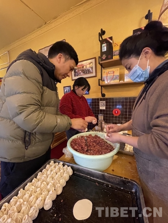 圖為嘎瑪澤仁(左)和員工一起包包子 攝影:索窮