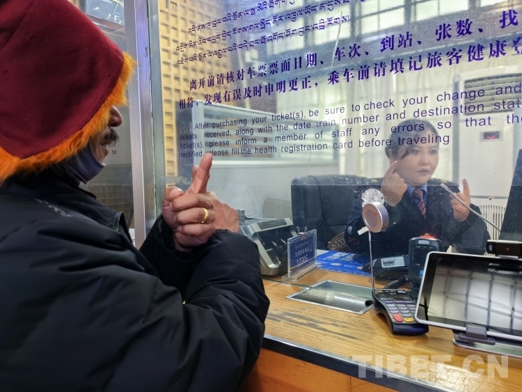 圖為李欣怡在拉薩火車(chē)站售票窗口用手語(yǔ)與旅客溝通