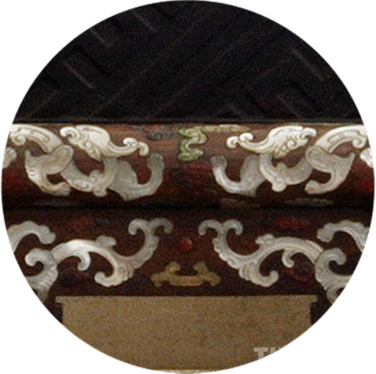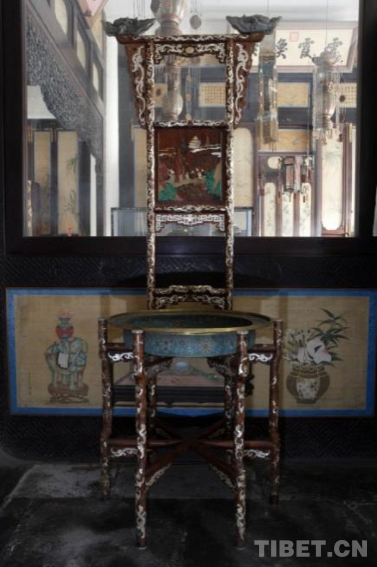 此款黃花梨木百寶嵌龍紋盆架,通體鑲嵌由螺鈿雕刻而成的草龍及拐子龍。前足高74.5厘米,通高201.5厘米,徑71厘米 。盆架六足,由兩層相交的棖子相連。選材優(yōu)良,質(zhì)堅(jiān)且木色、紋理俱佳。中牌子鑲嵌更見華麗,由牙、角、綠松石、壽山石、瑪瑙、金、銀等組成職貢圖,其中有高山陡崖、蒼松流水及各色人物,遠(yuǎn)處彩色祥云中呈現(xiàn)高大的殿堂,猶如人間仙境。(中國(guó)西藏網(wǎng) 綜合/周晶)