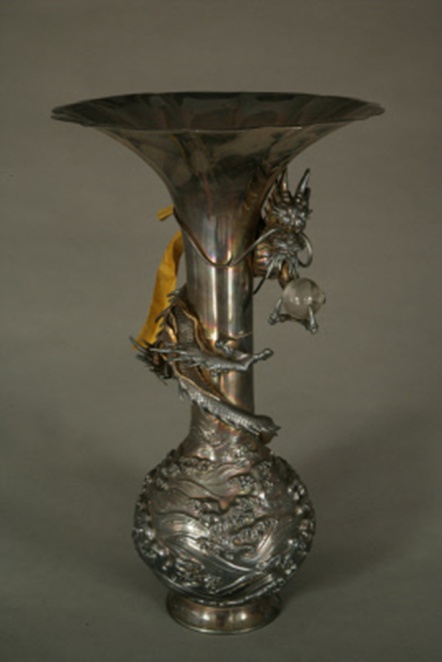 此款銀蟠龍紋花瓶,高39厘米,口徑22厘米,底徑9.5厘米。喇叭形口,長(zhǎng)頸,球形腹,底有圈足。瓶身腹部捶鏨裝飾,翻騰的海水中浪花飛濺,一長(zhǎng)龍從瓶頸基部躍出波濤,以圓雕形式大海盤旋而上,龍身纏繞瓶頸,龍首貼近喇叭形瓶口下,頭高昂,短粗的龍角豎立,伸出一龍爪擎一晶瑩剔透水晶球一枚。寓“龍戲珠”之意。銀瓶為一對(duì),是宮中的貢品,寓意“雙龍戲珠”。每只花瓶皆附有黃條,其上墨書:“小村壽太郎進(jìn)”字樣。