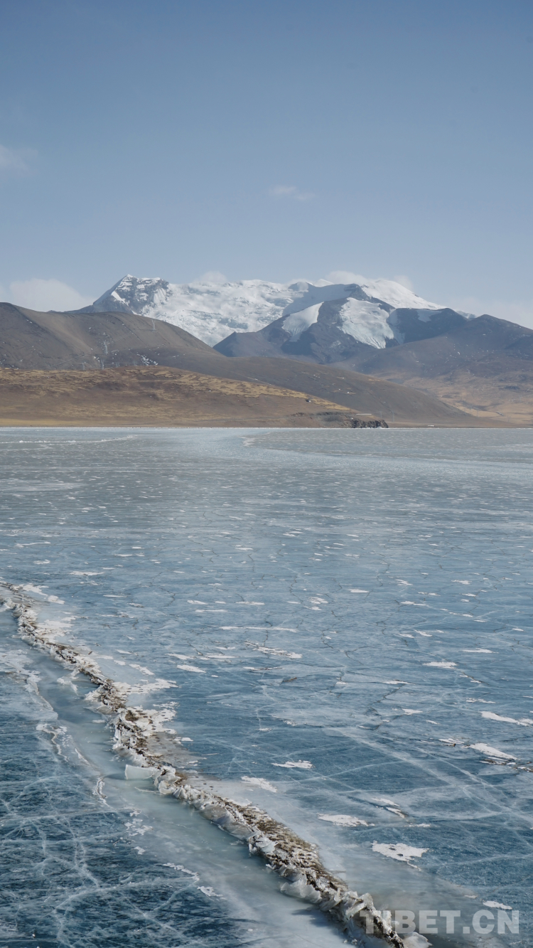 又見羊卓雍措是在冬日。與夏天不同,冬天的西藏常見大風。云一少,羊湖的藍愈加冷冽深邃。在去普瑪江塘鄉(xiāng)采訪的途中,還路過了普莫雍錯。與全年幾乎不結冰的羊湖不同,普莫雍錯已經(jīng)結為通透的藍冰。湖的邊緣像是在打浪的一瞬間凍結起來的,一層一層,走在上面稍不留神就會被湖面的大風吹倒。
