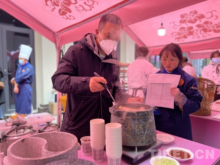 圖為林芝市職業(yè)技術(shù)學(xué)校師生在展示區(qū)烹飪石鍋藏香雞 攝影:德吉卓瑪