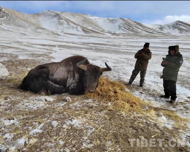 索南米瑪向記者介紹他手機(jī)里的工作照片,有一張是他和同事們?cè)诰戎活^野牦牛。這頭野牦牛由于年邁體衰,已經(jīng)無(wú)法站立,更無(wú)法覓食。管護(hù)員們及時(shí)為它送來(lái)食物和水,并定期過(guò)來(lái)查看喂養(yǎng)。一段時(shí)間過(guò)后,老牦牛還是去世了,為了保護(hù)當(dāng)?shù)卮嗳醯纳鷳B(tài)環(huán)境,管護(hù)員們及時(shí)收集處理了死亡的老牦牛。