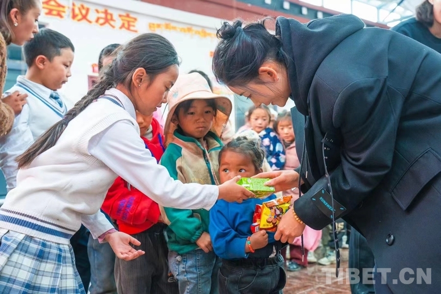 圖為洛桑卓瑪帶著自己拉薩的學員在日喀則市定日縣扎西宗鄉(xiāng)拉木堆村給當?shù)睾⒆觽兎至闶场 ?/p>