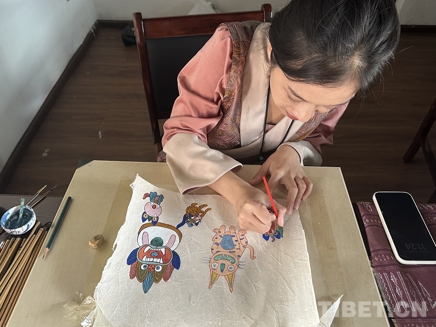 圖為畫師梁佩如在東巴紙上繪制瓦貓 攝影:楊眉笑