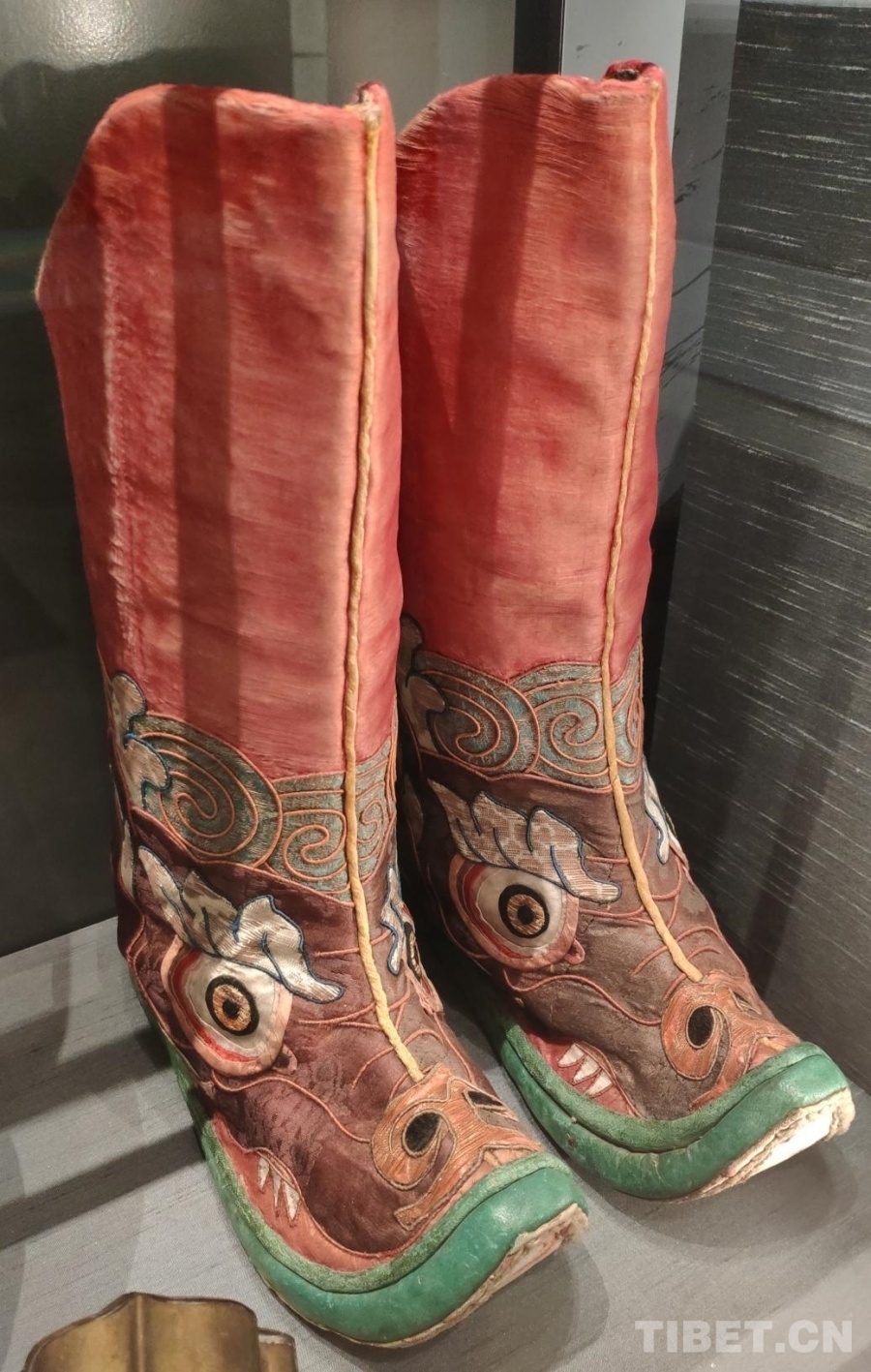 15號(hào)藏品為龍首紋藏靴,出自西藏,進(jìn)入館藏時(shí)間為1905年。據(jù)博物館介紹,這雙靴子不是一般藏族百姓穿的靴子,而是降神者在降神儀式上所穿用的。這雙靴子除了具有一般藏靴的特征外,鞋面繡有龍首,代表神圣之意。靴型寬大,前頭略尖,且向上翹起,造型別有韻致。