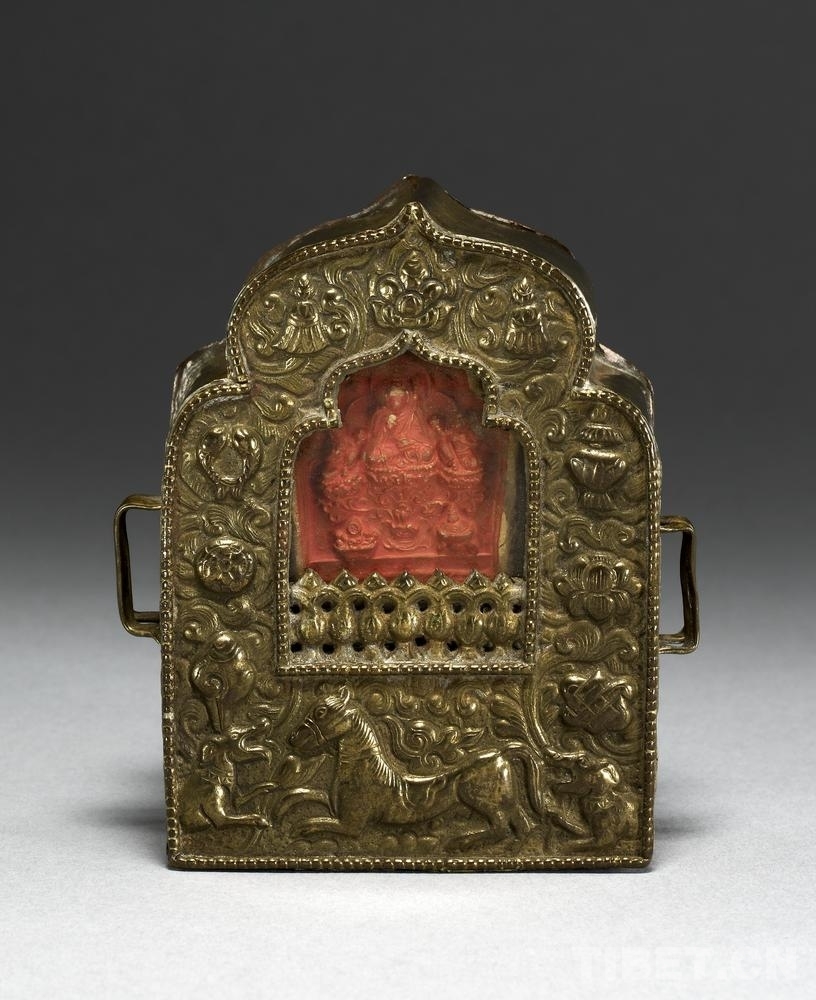 19號(hào)藏品為銅制“嘎烏”,內(nèi)裝有“擦擦”和香料包,出自西藏,進(jìn)入館藏時(shí)間為1905年?!案聻酢?,是藏語(yǔ)的音譯,指護(hù)身佛的盒子,即小型佛龕。盒子里一般裝有“擦擦”佛像、印著經(jīng)文的綢片、舍利子或者甘露丸、由高僧念過(guò)經(jīng)的藥丸,以及活佛的頭發(fā)、衣服的碎片等?!案聻酢边€是精美的裝飾品。其形狀不一,一般為銀質(zhì)或銅質(zhì),盒面上鑲嵌有瑪瑙、綠松石,雕刻有多種花紋圖案。