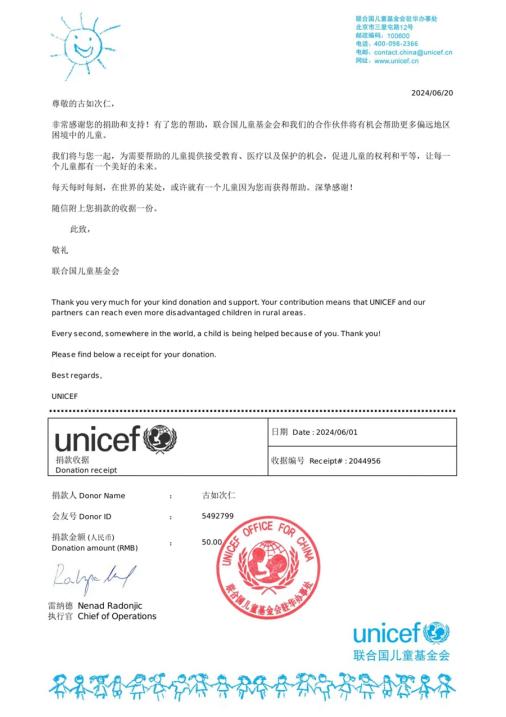 “之后的每個月我都會把省吃儉用節(jié)約下來的錢捐贈給聯(lián)合國兒童基金會,雖然每月捐贈的金額數(shù)不大,但我這幾年一直力所能及地堅持做著這件事?!惫湃绱稳收f,到大學(xué)后每月還有勤工儉學(xué)的收入,所以我會繼續(xù)堅持做這件事,能通過自己的方式幫助到貧困兒童非常有意義。
