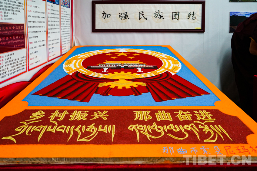中國西藏網(wǎng)訊 2024年那曲恰青賽馬節(jié)暨第三屆“鄉(xiāng)村振興 那曲奮進”活動現(xiàn)場,兩位來自那曲市索縣加勤鄉(xiāng)尼瑪林寺的僧人用彩砂繪制工藝繪制黨徽、國旗、國徽等彩砂作品,深切表達藏傳佛教僧人愛黨愛國愛教之情,用實際行動踐行聽黨話、感黨恩、跟黨走,加深信教群眾對于祖國的熱愛。