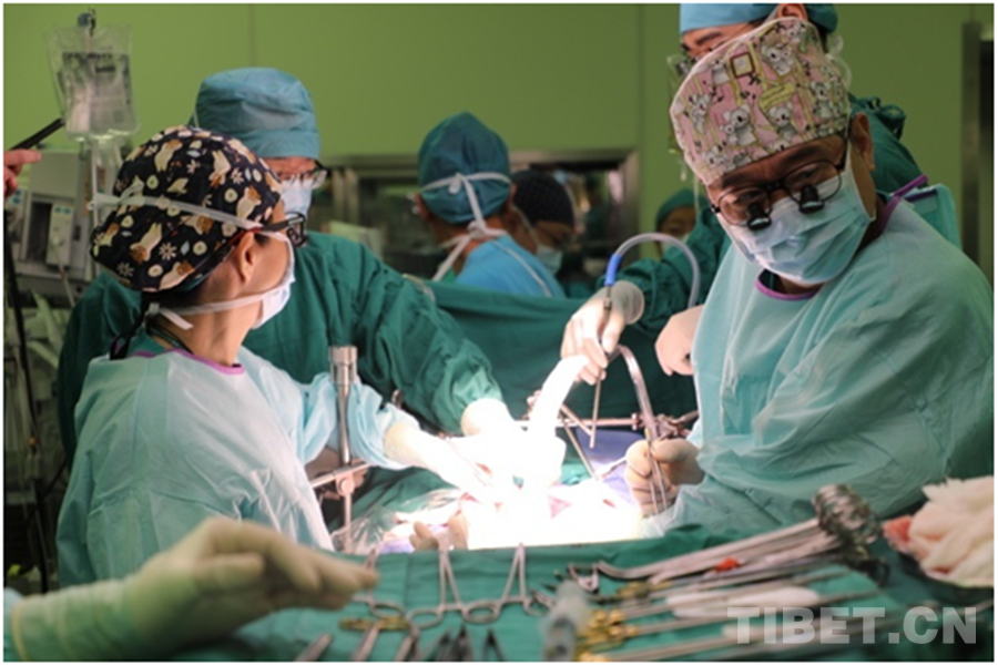 圖為醫(yī)療專家團隊正在為患兒實施手術(shù) 攝影:龍真多吉