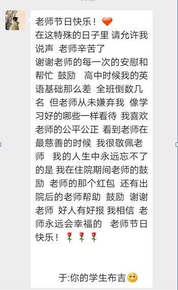 上大學(xué)時(shí),?我?guī)е鴱哪抢飳W(xué)到的堅(jiān)韌和自信,?踏入了這個(gè)全新的世界。?雖然大學(xué)生活與高中截然不同,?挑戰(zhàn)也更多,?但我始終記得您的教誨,?知道只要努力,?就沒(méi)有什么是不可能的。??每當(dāng)遇到困難,?我都會(huì)告訴自己,?就像您曾經(jīng)幫助我克服英語(yǔ)難題一樣,?我也能在這里找到屬于自己的路,于是更加堅(jiān)定了前進(jìn)的決心。?