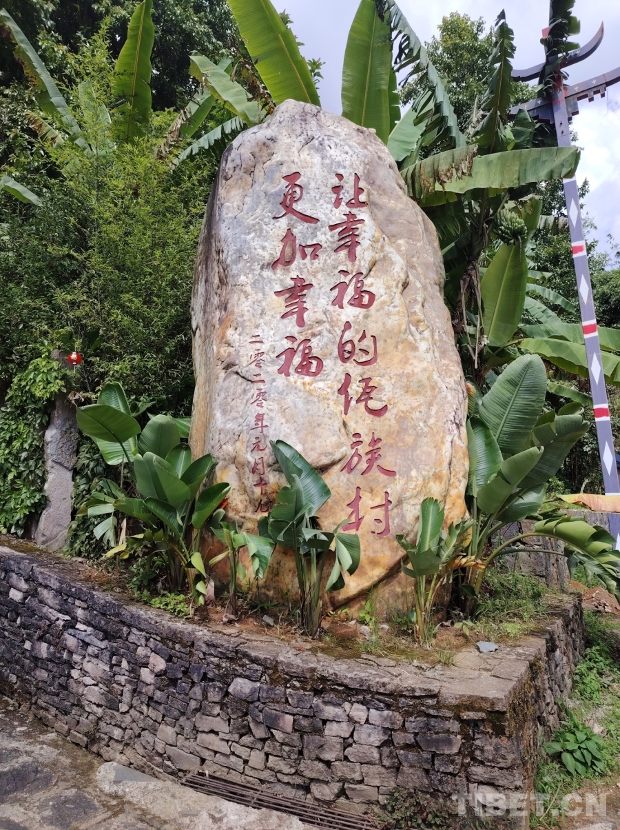 圖為司莫拉佤族村村口“讓幸福的佤族村更加幸福”石刻題詞。攝影:王東
