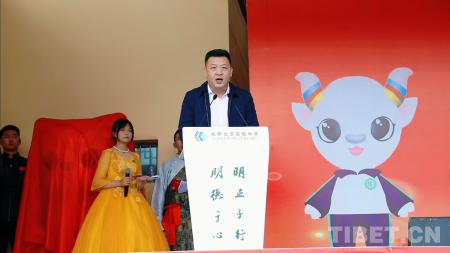 圖為梁新在拉薩北京實(shí)驗(yàn)中學(xué)十周年校慶上講話 圖片由校方提供