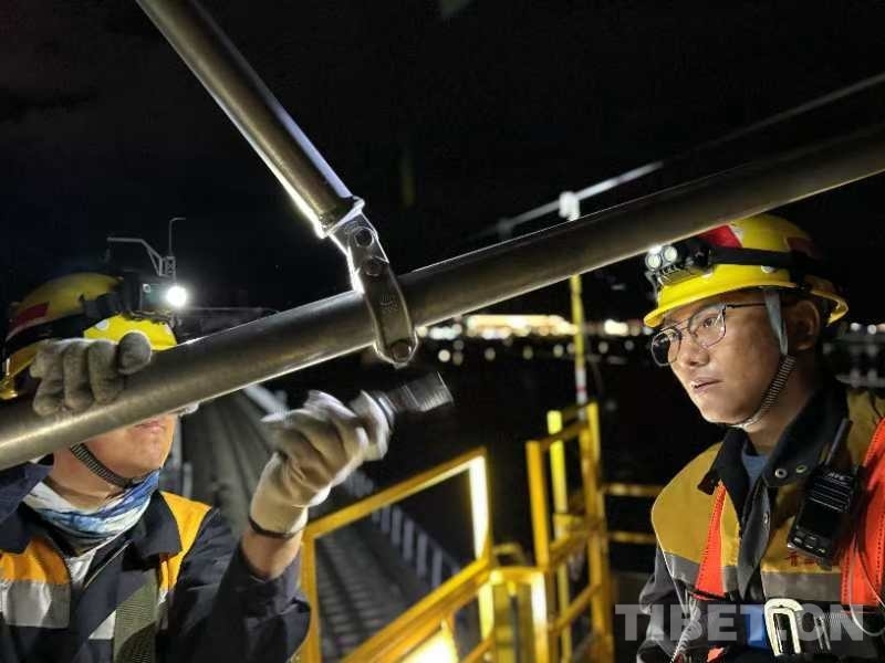 23時00分,軌道車穩(wěn)穩(wěn)???,“天窗”作業(yè)命令下達(dá)。中國鐵路青藏集團(tuán)有限公司拉薩基礎(chǔ)設(shè)施段供電維修技術(shù)中心拉薩南接觸網(wǎng)維修隊工長李積王帶著7名工友走下接觸網(wǎng)作業(yè)車,驗電、連接地線端、接掛地線……一系列操作一氣呵成。隨即,現(xiàn)場負(fù)責(zé)人拉加和工友們依次登上距離地面6米高的作業(yè)平臺上,穿梭于接觸網(wǎng)線索之間,猶如凌空“舞者”。