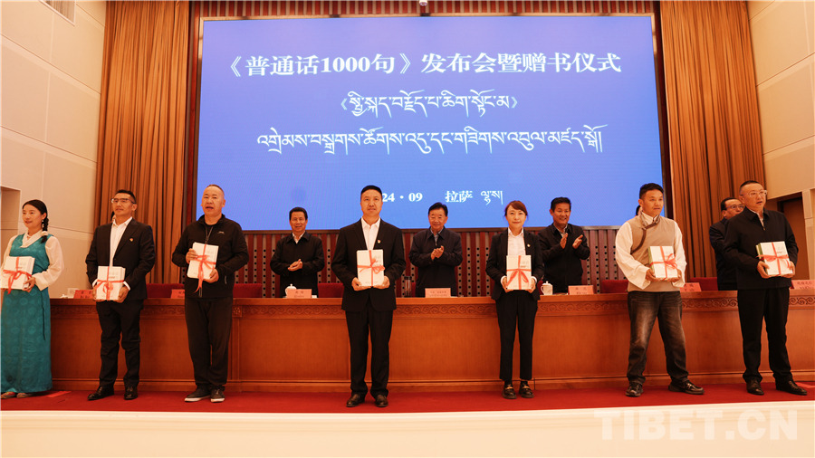 中國(guó)西藏網(wǎng)訊 為進(jìn)一步助力國(guó)家通用語(yǔ)言文字推廣普及,鑄牢中華民族共同體意識(shí)。9月20日,西藏自治區(qū)藏語(yǔ)委辦(編譯局)在拉薩舉行了《普通話(huà)1000句》漢藏對(duì)照版新書(shū)發(fā)布會(huì)暨贈(zèng)書(shū)儀式。西藏自治區(qū)政府副主席、自治區(qū)藏語(yǔ)委副主任甲熱·洛桑丹增出席會(huì)議,西藏自治區(qū)藏語(yǔ)委辦(編譯局)黨組副書(shū)記、主任(局長(zhǎng))達(dá)娃次仁作新書(shū)出版介紹,會(huì)上宣讀了教育部語(yǔ)文出版社發(fā)來(lái)的賀信,并向與會(huì)代表贈(zèng)書(shū)。