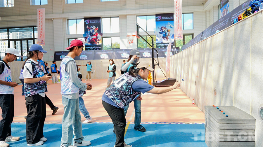 上午十點(diǎn),所有人員集中在卓夢南環(huán)體育公園,在總教練晉美次旦的講解和帶領(lǐng)下,開始熱身、熟悉游戲規(guī)則和獎勵辦法、進(jìn)行分組等,一切準(zhǔn)備就緒后,趣味活動正式開始。上午的活動開設(shè)了中國古代投擲游戲趣味投壺、西藏傳統(tǒng)民間體育游戲趣味打牛角和阿久、趣味飛盤、趣味旱地冰壺等多種傳統(tǒng)和流行的運(yùn)動項目。