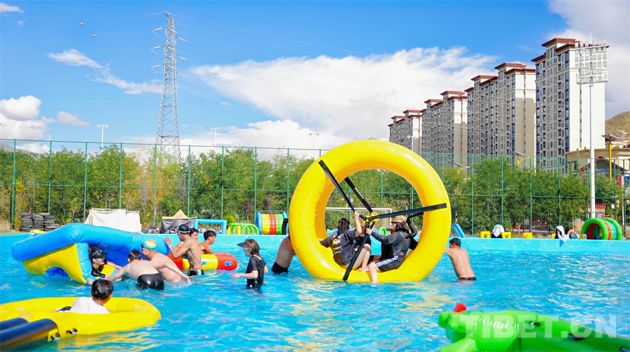 圖為參賽選手們體驗(yàn)水上趣味活動
