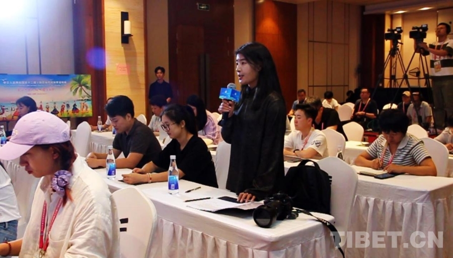 圖為中國西藏網(wǎng)記者在第十二屆全國少數(shù)民族傳統(tǒng)體育運動會黑龍江、福建、西藏代表團(tuán)新聞發(fā)布會上提問 攝影:劉莉