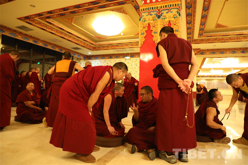 下午,師生們旁聽(tīng)了中國(guó)特色社會(huì)主義理論和憲法與法律基礎(chǔ)等課程。晚上,開(kāi)展了精彩非凡的辯經(jīng)活動(dòng)。學(xué)員們各自組團(tuán)尋找“對(duì)手”,大廳里激烈的辯論聲、擊掌聲此起彼伏,場(chǎng)面熱烈,氣勢(shì)逼人。辯經(jīng)是藏傳佛教中一種獨(dú)特的學(xué)習(xí)方式,通過(guò)對(duì)辯雙方邏輯清晰、言之有據(jù)的反復(fù)辯論,加深學(xué)習(xí)理解。