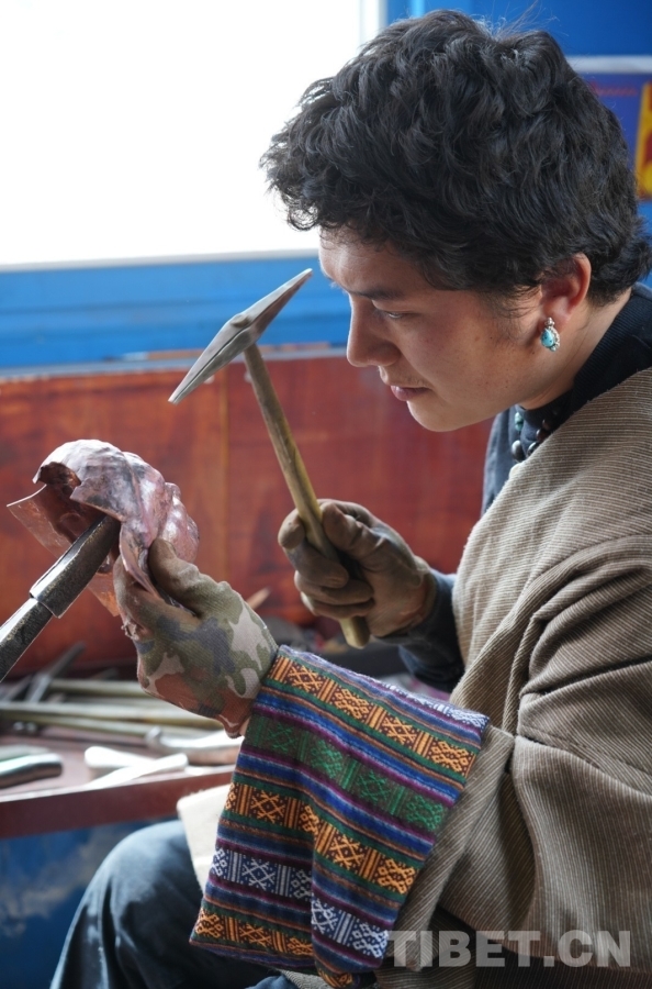 叮叮叮,叮叮叮……工坊二樓,傳來一陣陣金屬敲擊的聲響。掀開門簾,一個小伙子坐在窗邊,右手拿錘,左手握著佛像架在細(xì)長的鐵器上,右手的錘子不停地敲擊著,左手也在一邊輕微轉(zhuǎn)動,目光緊緊鎖在眼前的佛像上柔和而堅(jiān)定,古銅色的面龐與紅銅佛像仿佛在進(jìn)行無聲的“對話”。