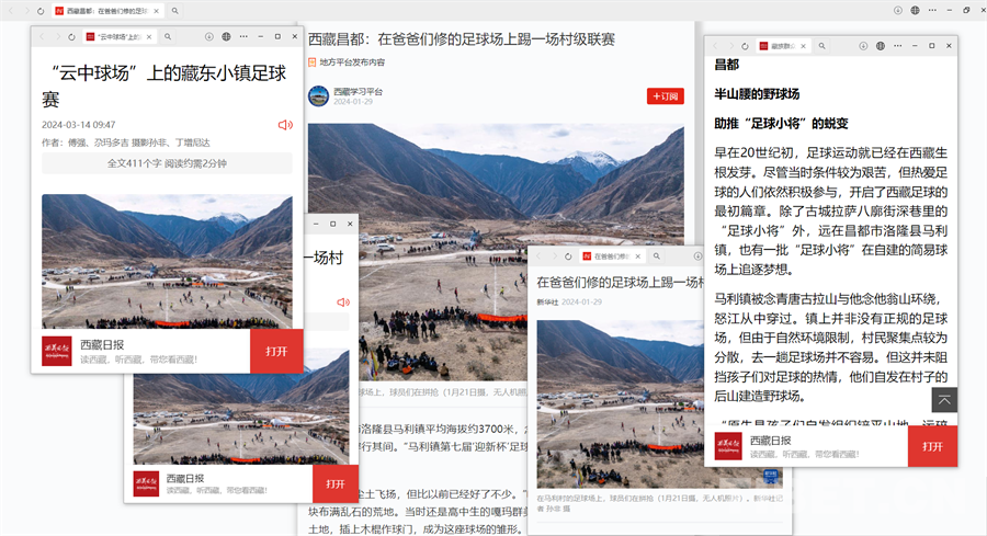今年一月,延續(xù)七屆的馬利鎮(zhèn)足球“迎新杯”在“爸爸們修建的足球場”開賽的消息備受關(guān)注。一時間,《在爸爸們修建的足球場上踢一場村級聯(lián)賽》《“云中球場”上的藏東小鎮(zhèn)足球賽》《半山腰上的野球場 助推“足球小將”的蛻變》多篇稿件在China Daily、新華社、西藏日報、學(xué)習(xí)強國、昌都發(fā)布等平臺紛紛亮相,引起不少關(guān)注。