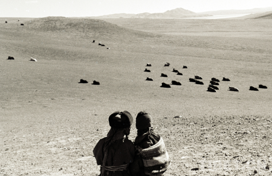 圖為藏北雙湖辦事處(現(xiàn)雙湖縣)嘎措鄉(xiāng)二村兩名兒童正在瞭望牦牛群(唐召明1988年攝)