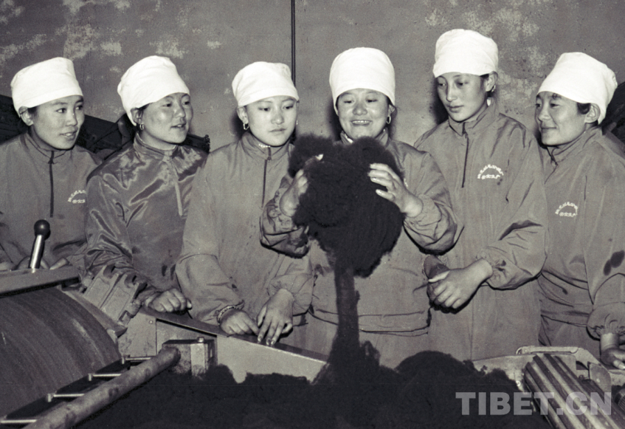 圖為過去手拿牧鞭的牧女格桑措姆(左四)和同伴們?cè)谝黄鸱窒韯趧?dòng)成果——優(yōu)質(zhì)牦牛絨。她們都是藏北班戈縣絨毛分梳廠的生產(chǎn)能手(唐召明1994年5月2日攝)