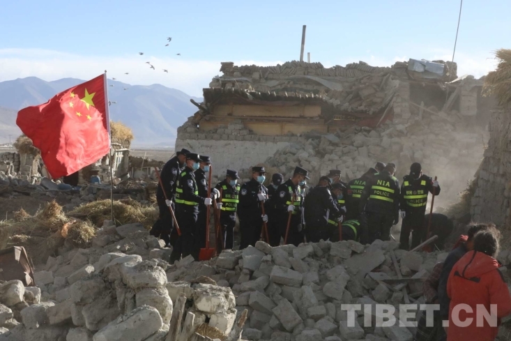 圖為西藏移民管理警察在國旗下開展地震救援,守護(hù)人民群眾 攝影:郭遠(yuǎn)敬