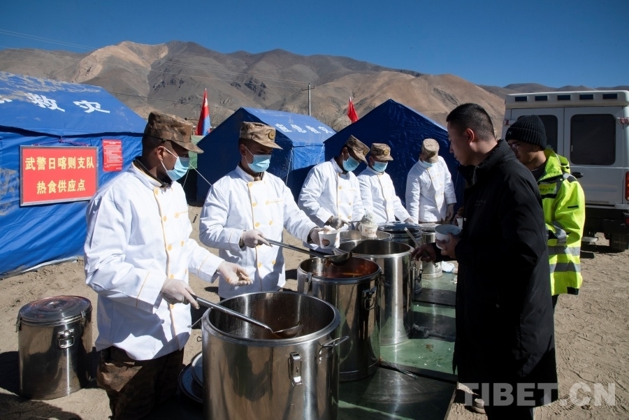 圖為武警日喀則支隊官兵正在向受災群眾供應熱食 攝影:趙振宇