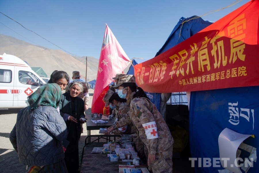 圖為中國人民解放軍西藏軍區(qū)總醫(yī)院醫(yī)務人員正在森嘎村向受災群眾提供醫(yī)療服務 攝影:趙振宇