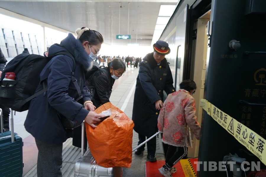 不一會,等待檢票上車的人排起了長隊,他們是來拉薩朝圣結(jié)束準(zhǔn)備回家的藏族老人,他們是結(jié)束了一年工作回鄉(xiāng)過年的外地務(wù)工人員,他們是來拉薩探親的母子,他們是去成都與家人團(tuán)聚的母女三人……短短15節(jié)車廂,囊括了中華民族各族群眾在春節(jié)來臨時短暫相聚于火車上的世間百態(tài):大包小包的行李、火車上準(zhǔn)備的食物、手中的轉(zhuǎn)經(jīng)筒、和媽媽撒嬌的孩子、手機上跳動的畫面……