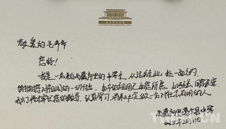 “敬愛的毛爺爺,您好!我是一名來自西藏阿里的中學(xué)生。從遠(yuǎn)方至此,赴一面之約。謝謝您對祖國的一切付出。如今的祖國如您所愿,山河無恙,國泰民安。我們將牢記您的教導(dǎo),認(rèn)真學(xué)習(xí),將來必定做一名對社會有用的人!”