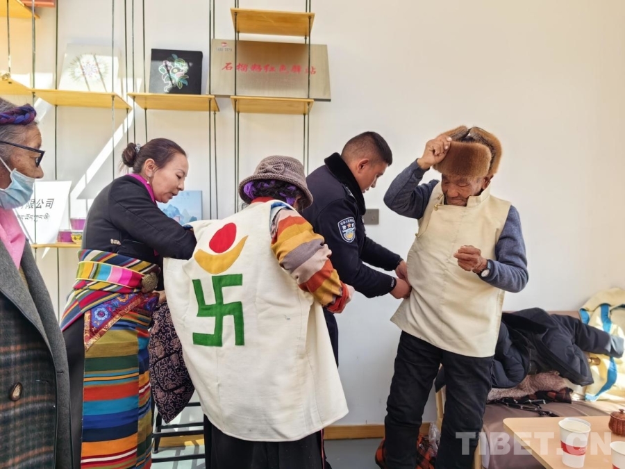 圖為工作人員為社區(qū)老人穿上藏式服裝
