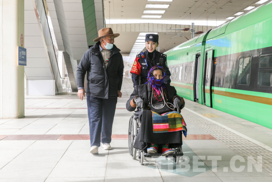 圖為乘警余丹措護送乘坐輪椅的旅客便捷乘車