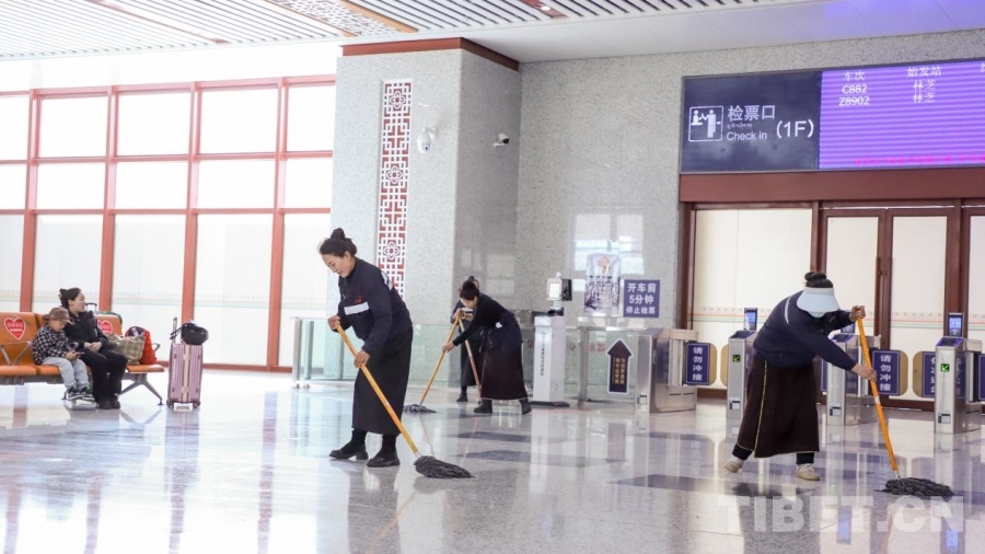 圖為幾位在林芝火車站就業(yè)的孜然村村民正在打掃衛(wèi)生 攝影:賈華加