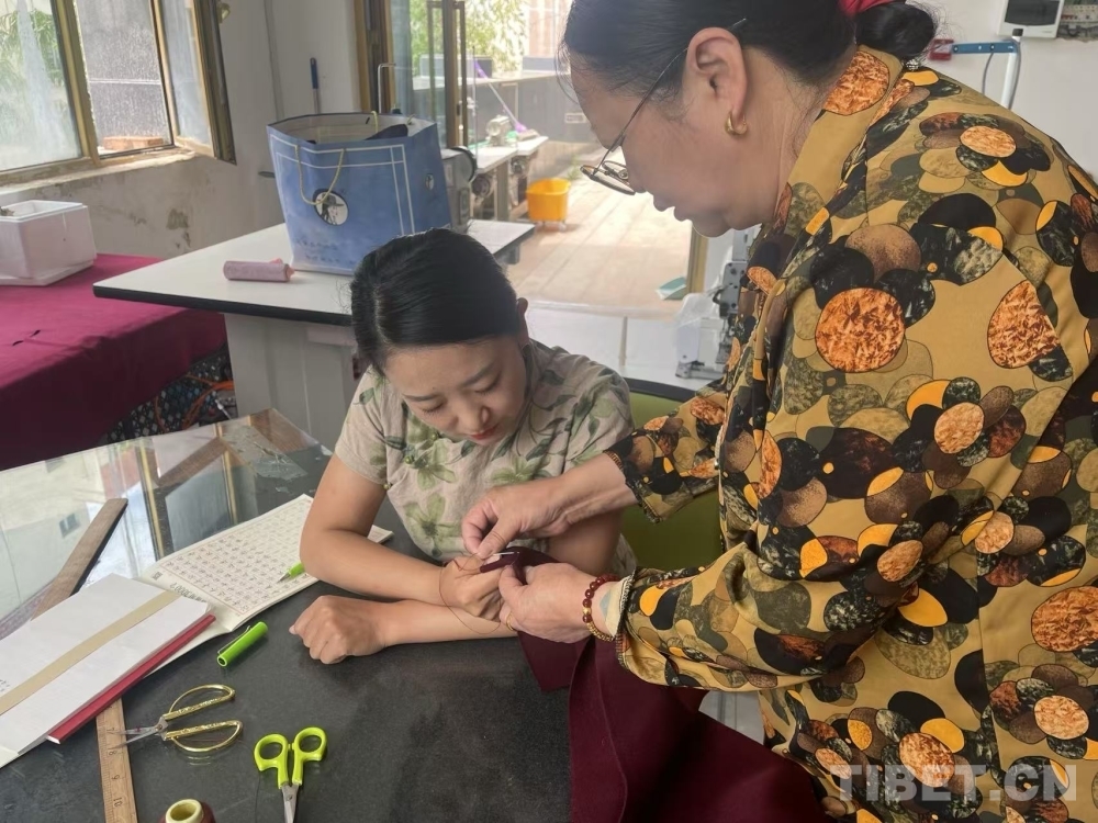 圖為仁青卓瑪(左)和母親在討論細節(jié)