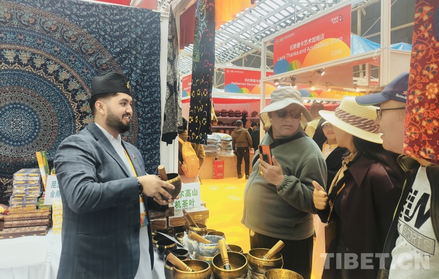 二樓是來自尼泊爾、印度和西藏本地的各色商品,包括金屬雕像、金屬工藝制品、唐卡、羊絨服裝、木制工藝品和金銀首飾等,同樣吸引了不少顧客。在一家尼泊爾工藝品攤位前,尼泊爾商人輕輕敲擊手上的缽狀物品的邊緣,頓時,輕盈悅耳、飽滿悠遠的裊裊金屬音傳出,仿佛能浸潤心靈深處。這便是頌缽,一種由多種金屬及天然礦石制作的合金器皿,令不少人隨音駐足。另一家名為“來自尼泊爾的禮物”的攤位前,各種羊毛氈制成的卡通手辦色彩多樣,萌趣多多,有顧客在詢問批量拿貨價格和報關(guān)清關(guān)等事宜,看來開展第一天商家就迎來了大單。