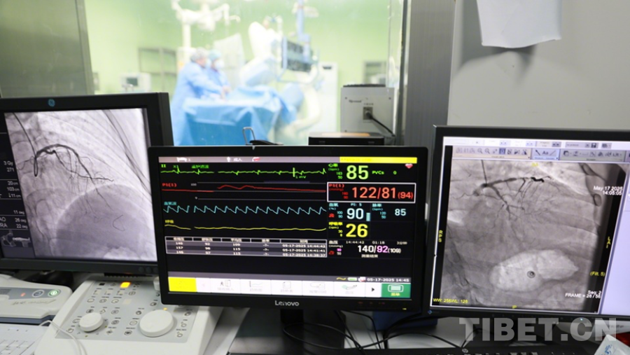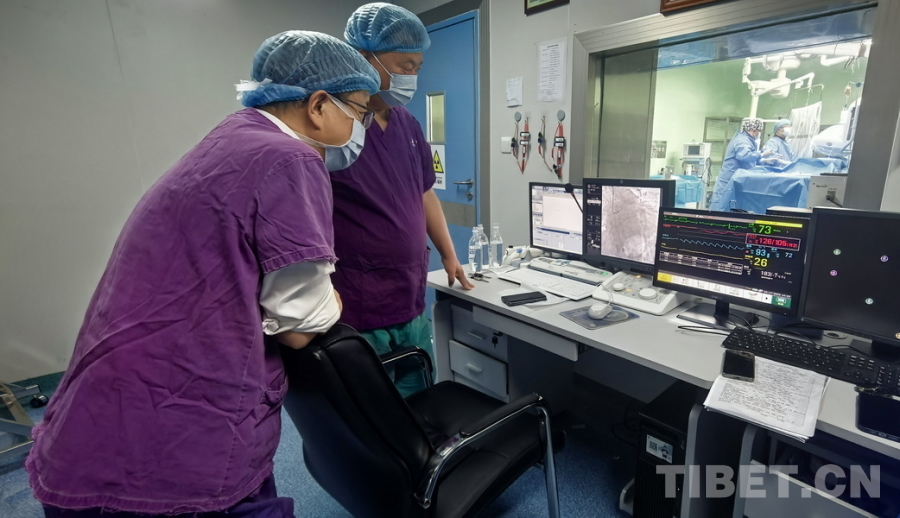 圖為陰赪茜(手術(shù)室內(nèi)右)趕赴阿壩州人民醫(yī)院手術(shù)救治急性心?;颊?,通過比對屏幕上的畫面,術(shù)后(左側(cè)屏幕)患者的心臟血管血流已較術(shù)前明顯恢復(fù) 攝影:劉莉