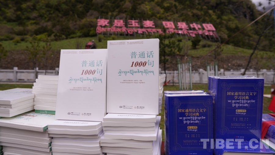 圖為《普通話1000句》漢藏對照版、《國家通用語言文字學(xué)習(xí)詞典》(藏文對照)等書籍